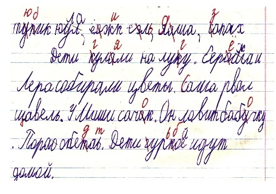2. Нарушение формирования процесса письма. Встречается в 1–2 классе в 7–8 лет, когда дети смешивают печатные и письменные буквы, пропускают слоги, слова.